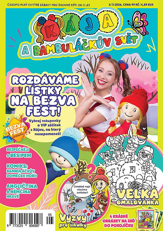 Nový časopis, který spojuje dva výrazné fenomény na poli dětské zábavy – Káju a Bambuláčka a Bambuláčkův svět. Ty si díky svým pořadům na YouTube vybudovaly širokou fanouškovskou základnu se statisíci odběrateli. Časopis, kterým provázejí jejich dobří známí Kája, Bambuláček a Bambulinka, nabízí chytrý mix zábavy, včetně praktických a edukativních částí.Highlighty prvního čísla:* pexeso jako dárek* exkluzivní společenská hra Bambuláčkovo velké putování* kurz angličtiny a němčiny od profesionální školy Rolino* pohádka na dobrou noc s QR kódem, kde pohádku čte dětem samotná Kája+ 10 stran kreslení, vystřihování, praktických úkolů:- velká omalovánka- bludiště- dokreslení logických řad- kreslení podle čísel- cvičení kreslících dovedností- vystřihuj oblečky a oblékni Bambuláčka s Bambulinkou- najdi 10 rozdílů a spousta dalších+ obrázky, které děti posílají Káje a Bambuláčkovi+ komiksový příběh s Kájou, Bambuláčkem a Bambulinkou+ nejlepší příběhy z YouTube+ ranní rozcvička s Kájou
